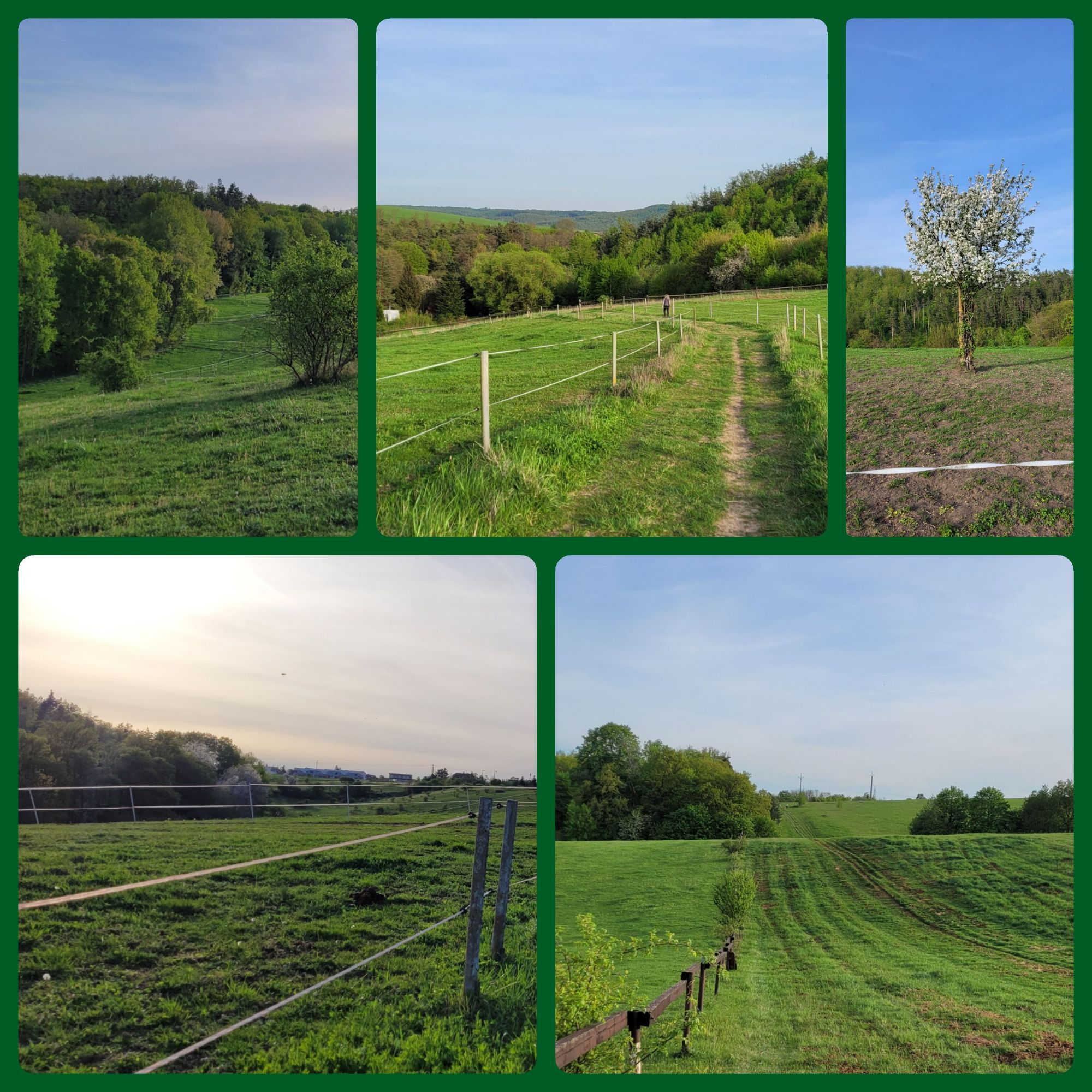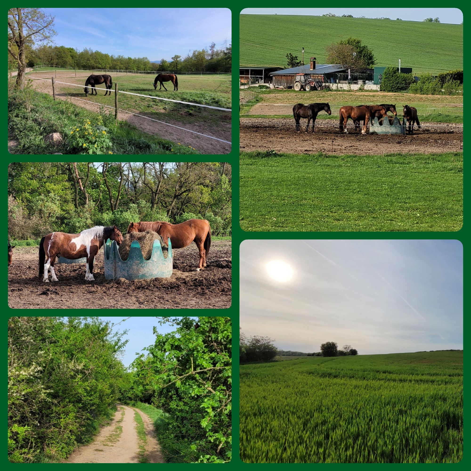 Links unten: unser Begrüßungskommittee, rechts unten: Blick von unserem Balkon auf den Vielseitigskeits- sowie Abreiteplatz