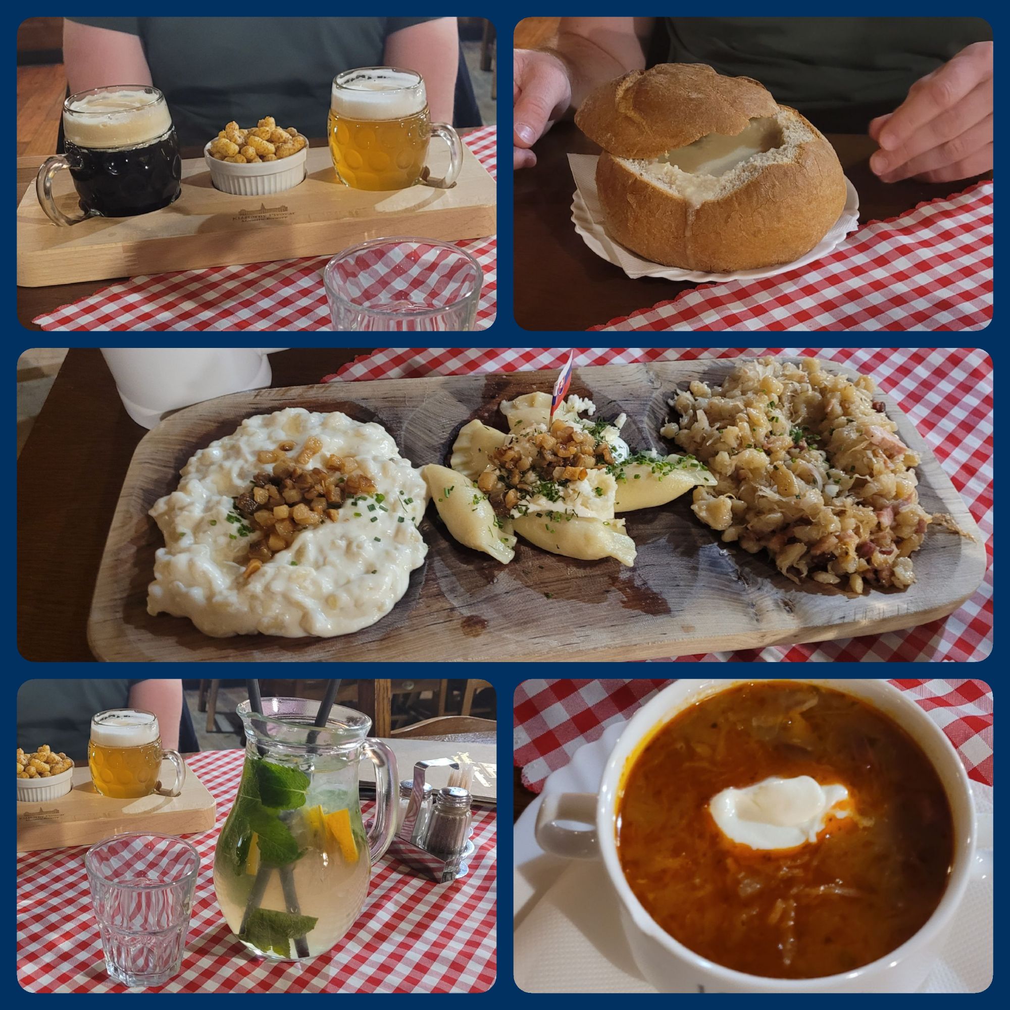 Gesessen haben wir typisch slowakische Gerichte: Knoblauch-Creme-Suppe im Brotlaib, Sauerkrautsuppe mit 3erlei Fleisch, Wurst und Sauerrahm, gemischte Platte mit Bryndzové halušky (Brimsen-Nocken mit Sauerrahm-Frischkäsesoße), Bryndzové pirohy (Brimsen-Piroggen gefüllt mit Schafkäse) und Kapustové strapačky so slaninkou (Brimsen-Nocken mit Sauerkraut und Speck)