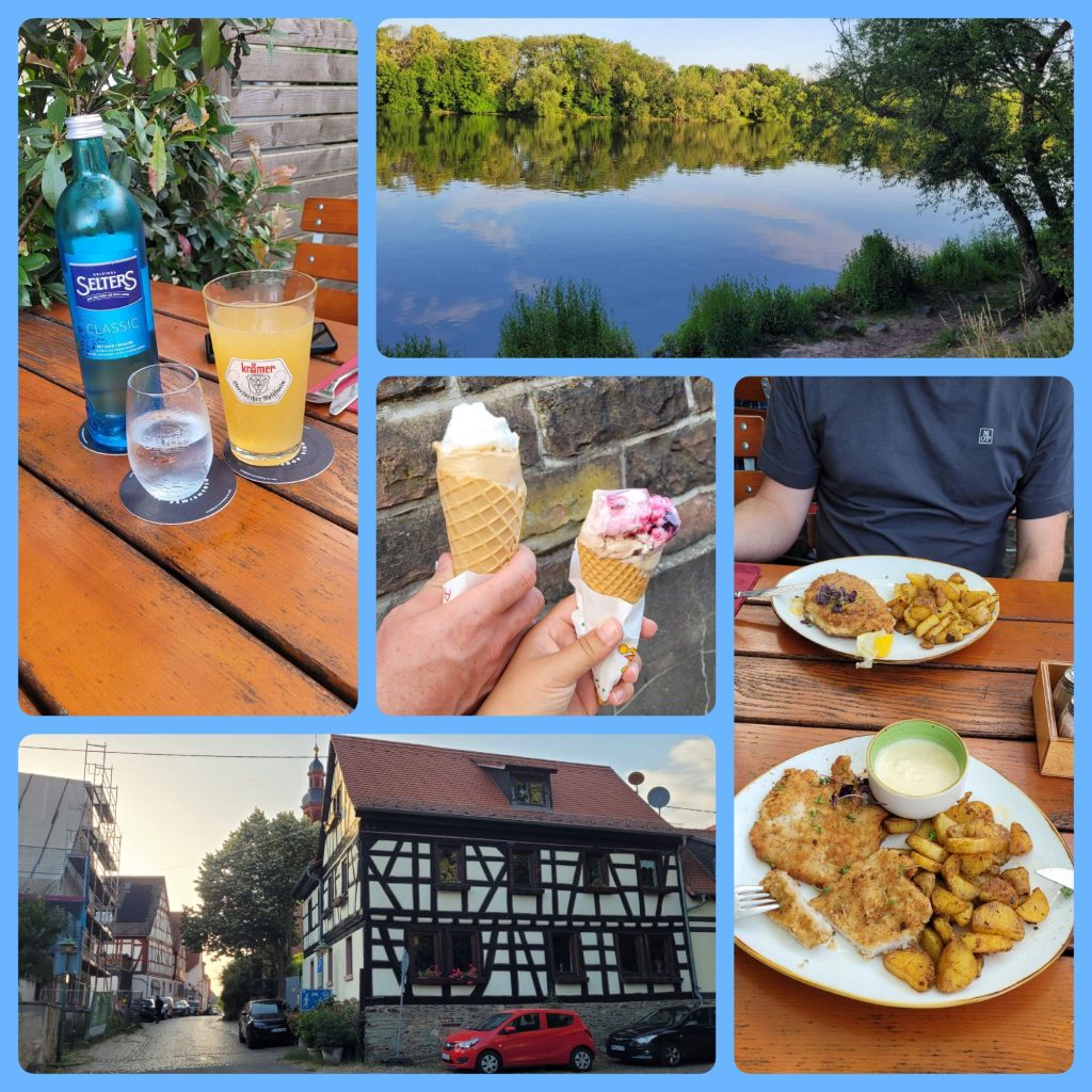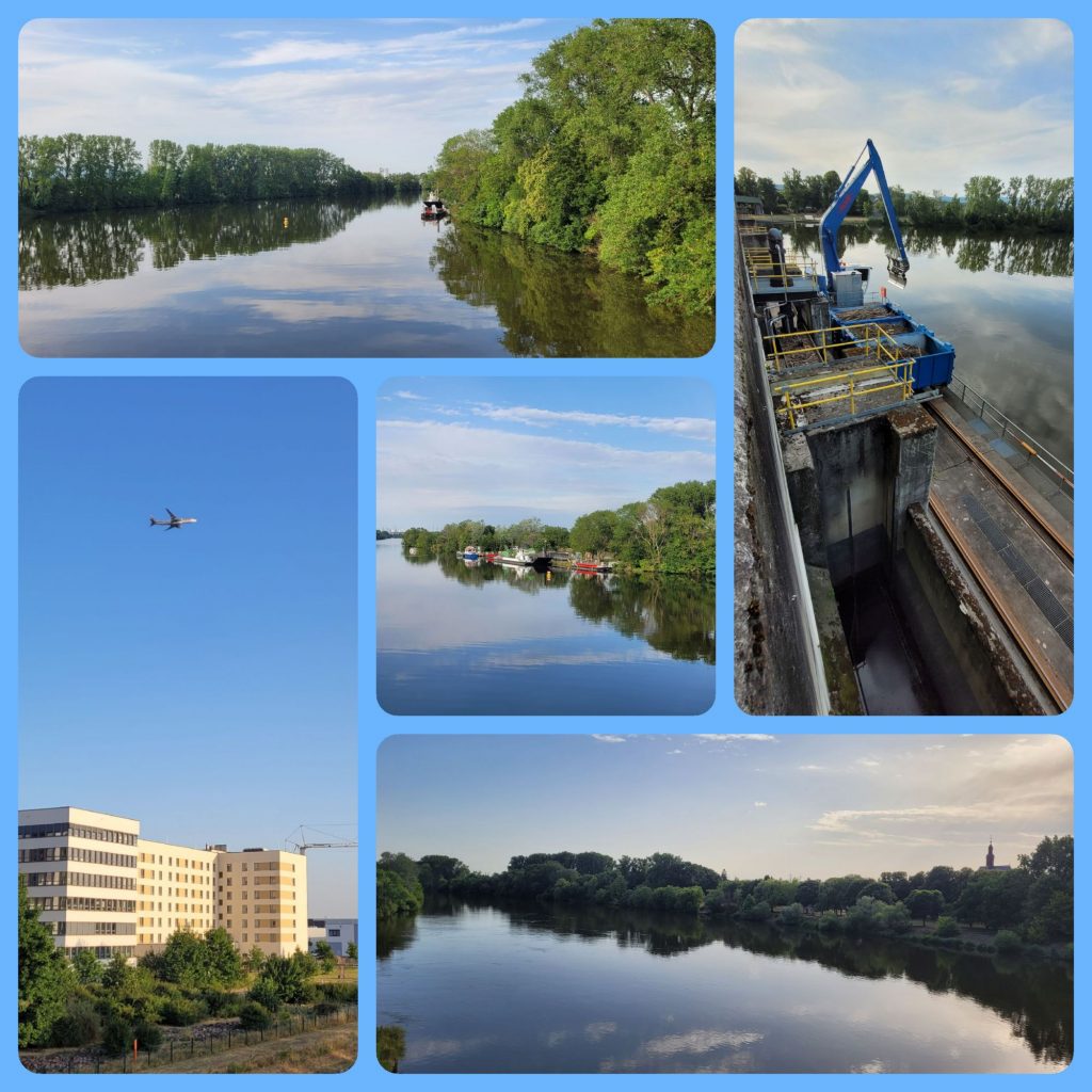 Nachdem der Tag schon fortgeschritten war, ging’s auf Futtersuche auf die andere Seite des Mains. Dafür mussten wir über die Schleuse und an der Staustufe vorbei gehen. Und sind dann in einem gut bürgerlichen hessischen Restaurant eingekehrt.