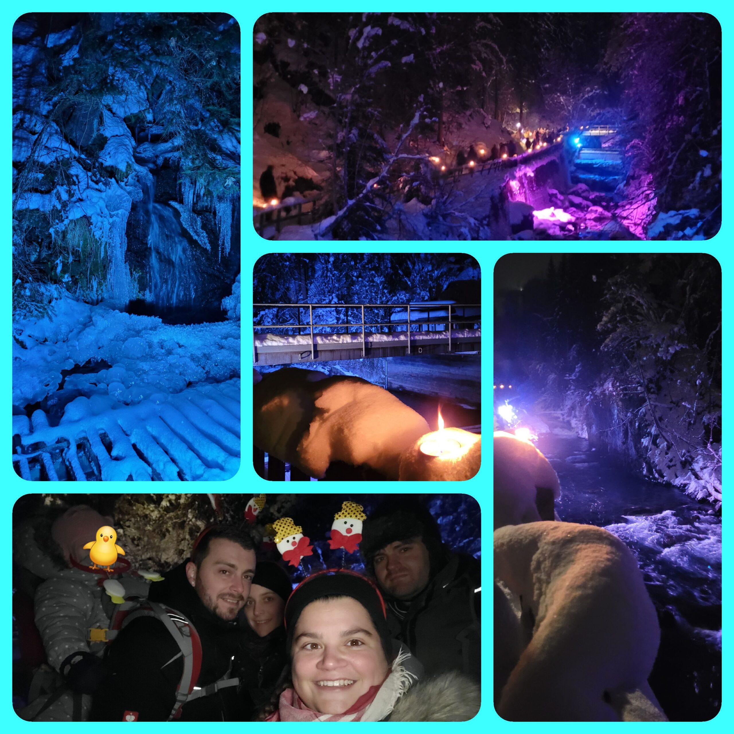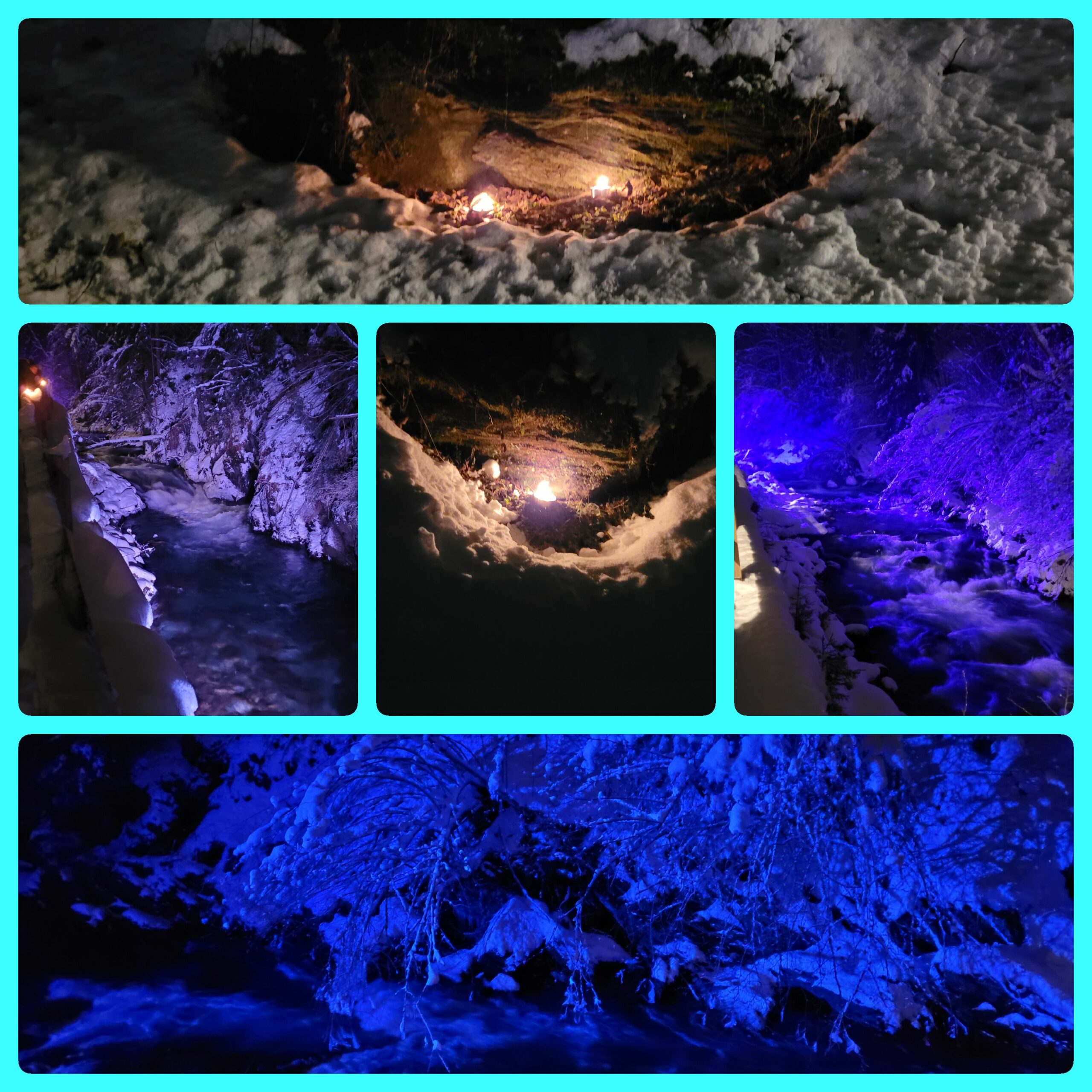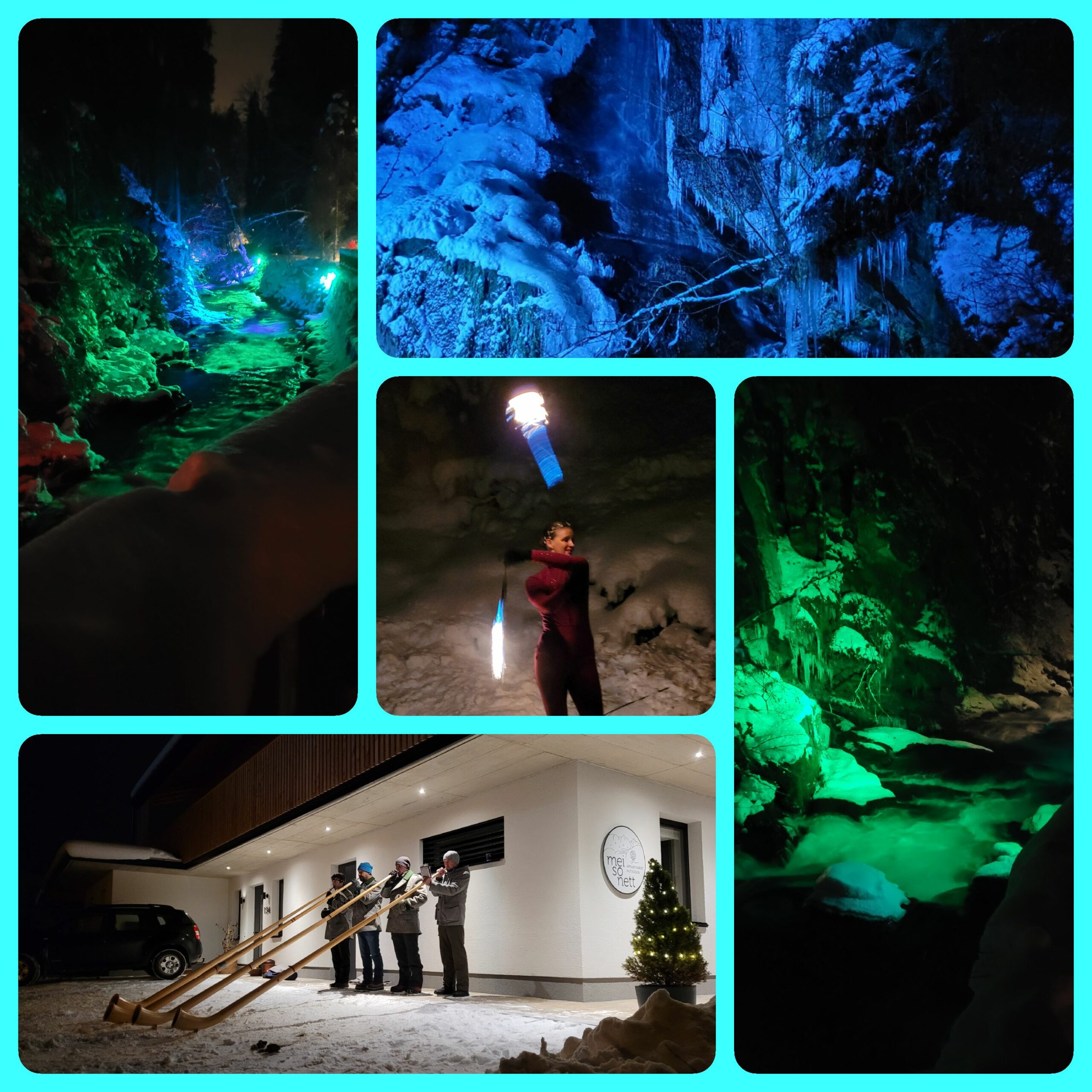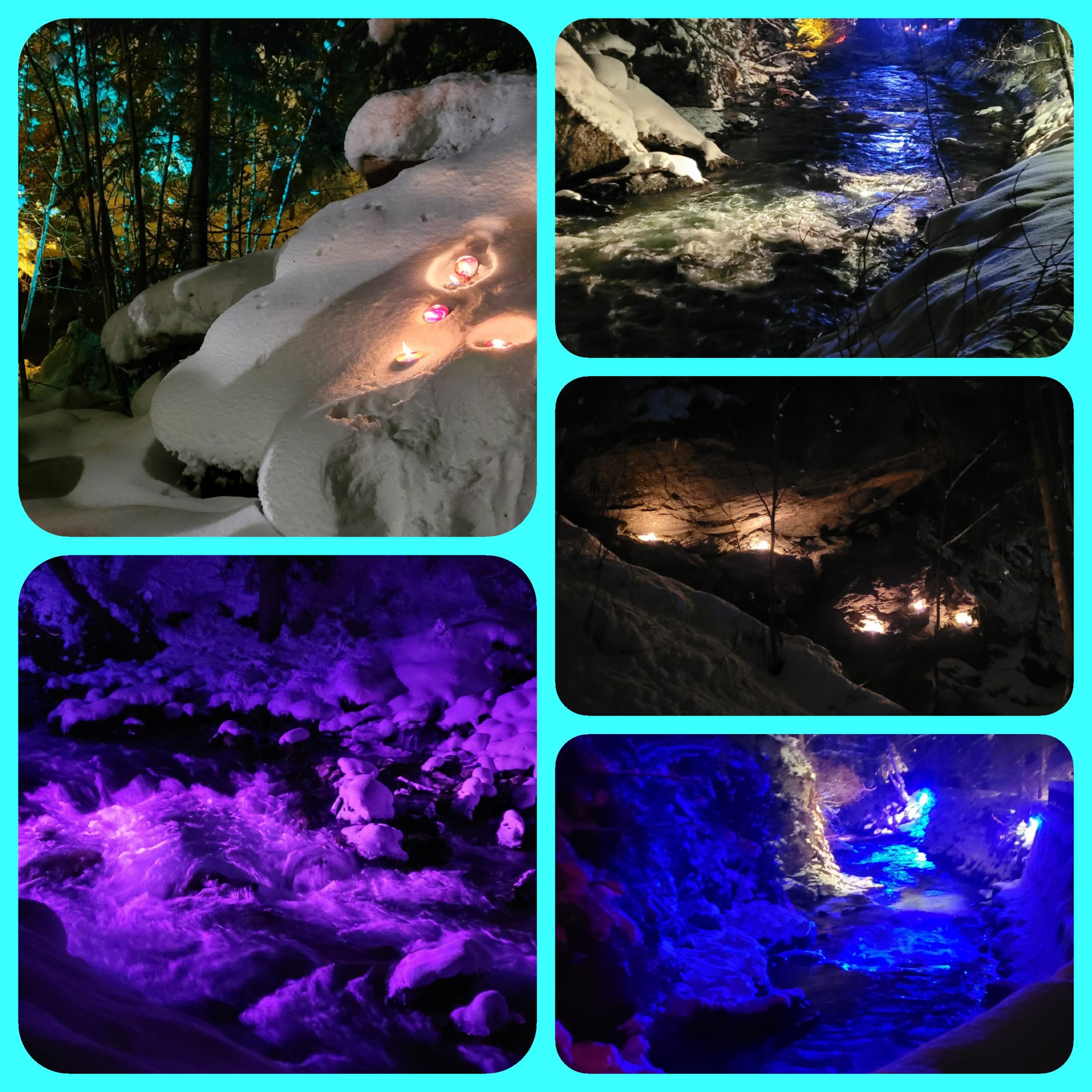 Und schon ging es weiter zur nächsten Etappe. Der Talbachklamm in Schladming. Deren Wanderweg war mit Kerzen 🕯️und Künstlern gesäumt. Und das Highlight, die Klamm war beleuchtet! 🏮