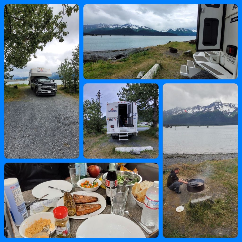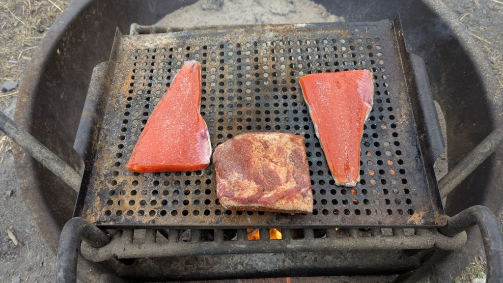 Endlich angekommen, wurde Feuer angezündet und frischen, wild gefangenen Sockeyelachs gegessen, den wir bei einem Fischhändler am Hafen gekauft hatten. Sehr lecker – und diese Farbe! 😋