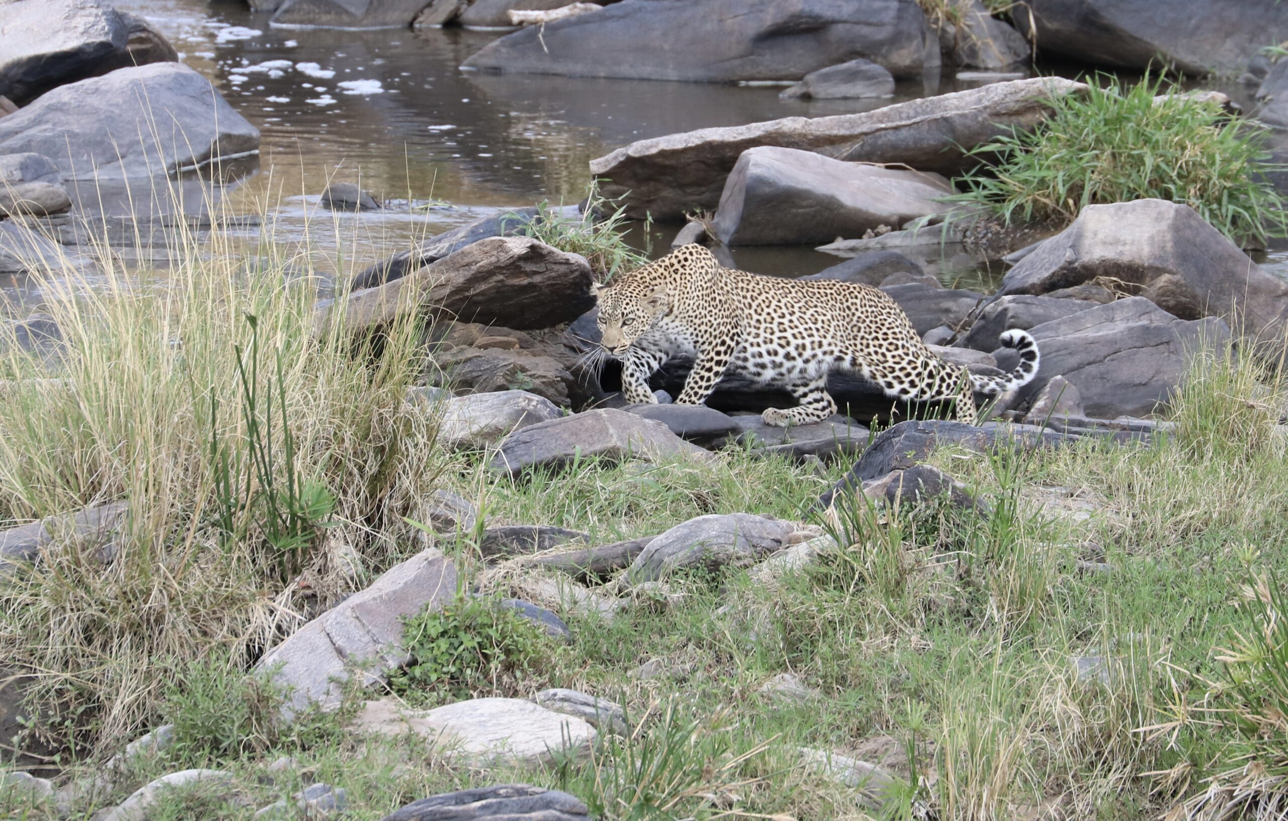Die ersten 2,5 Stunden waren ganz „normal“ und wir haben wieder viele Tiere inklusive Löwen und 2 Geparden gesehen. Gegen 3 Uhr hieß es über Funk dann – Leopard gesichtet. Wir also direkt hin. Erst mal haben wir überhaupt nichts gesehen, aber nach ca. 10 min. Hat Peter dann auf einmal den Schwanz des Leos entdeckt. Also haben wir für die nächsten 2 Stunden nicht anderes gemacht als einem zuckendem Leopardenschwanz zwischen hohem Gras zuzuschauen. Kurz bevor wir wieder los mussten (wir sollten eigentlich spätestens 6 am Camp sein), hat sich um 5 vor 6 endlich der ganze Leopard gezeigt 🙂 Markus hat allein in den 10 Minuten solange wir ihn gesehen haben, ca. 80 Fotos gemacht 🙂 Aber das war ein Erlebnis – unsere Hartnäckigkeit hat sich tatsächlich noch bezahlt gemacht!!