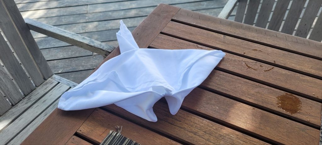 Beim Mittagessen haben wir und dann mit Naail (unserem „persönlichen“ Kellner) über unsere Rochensichtung unterhalten und er hat uns mit Servietten- Tieren dann die einzelnen Arten erklärt.