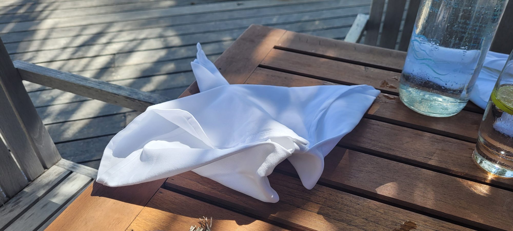 Beim Mittagessen haben wir und dann mit Naail (unserem „persönlichen“ Kellner) über unsere Rochensichtung unterhalten und er hat uns mit Servietten- Tieren dann die einzelnen Arten erklärt.