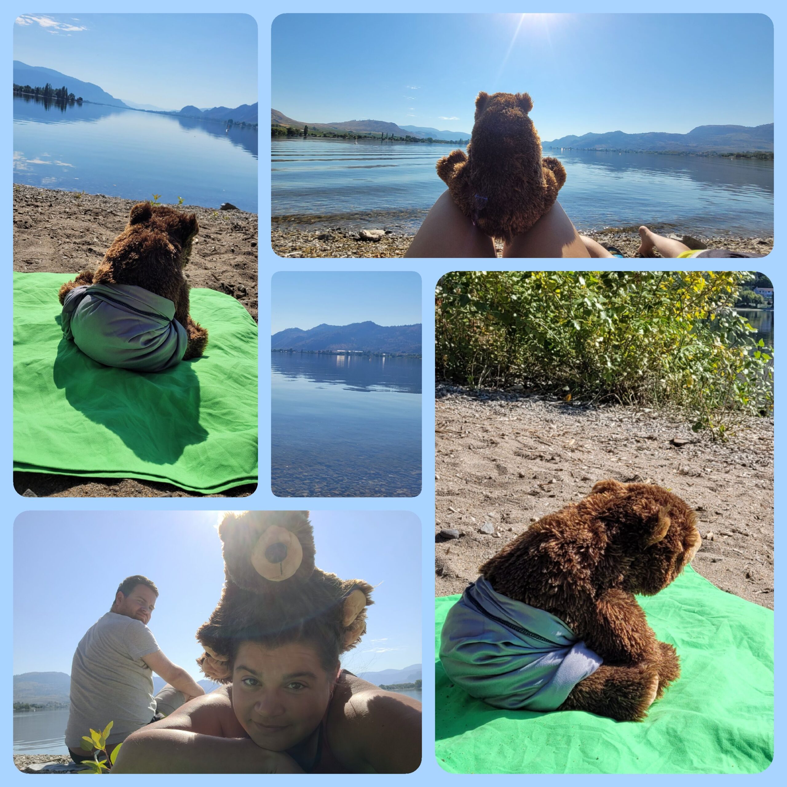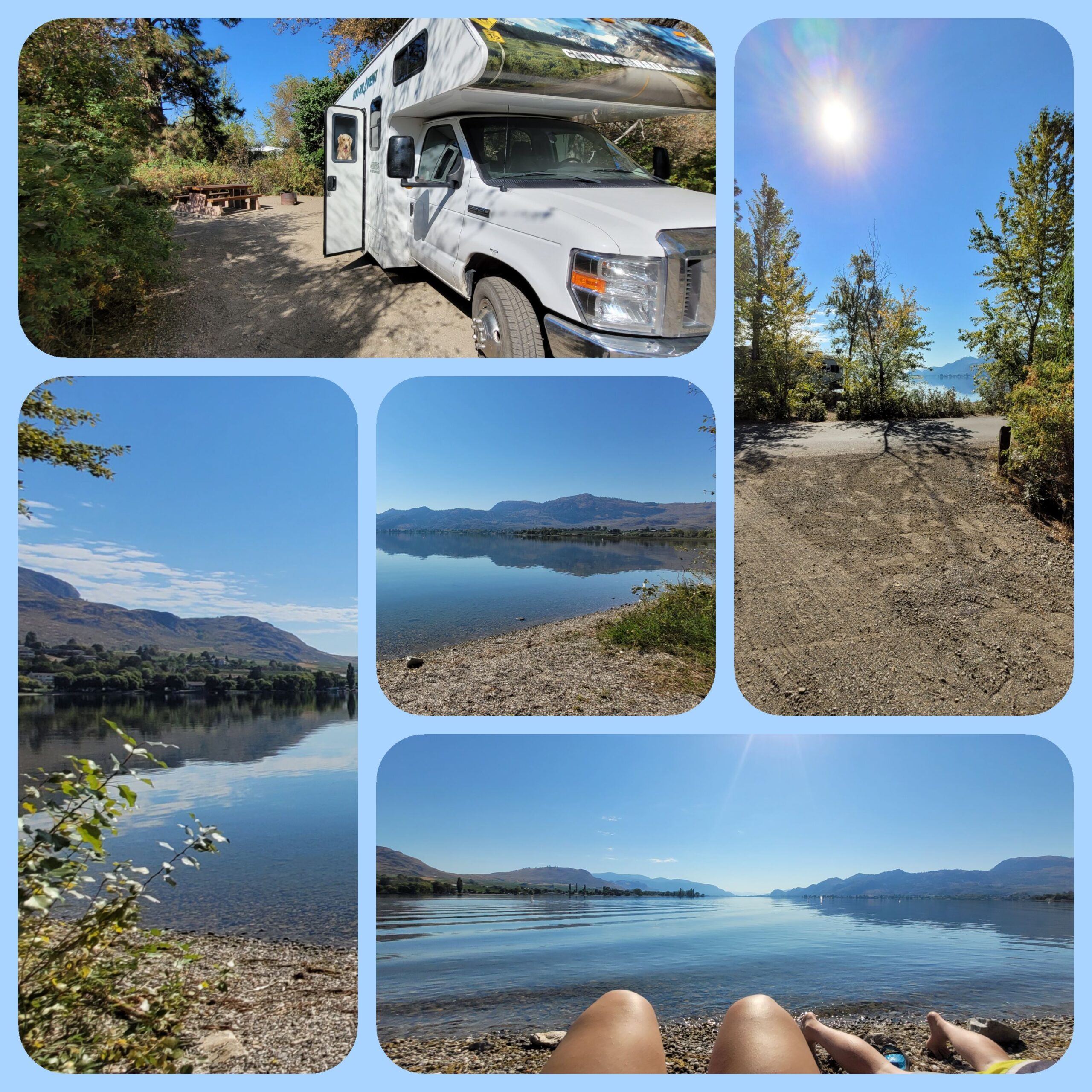 Gegen Mittag waren wir dann schon auf unserem Campingplatz. Dieser liegt auf einer kleinen Halbinsel mitten im Osoyoos Lake. Wir haben sogar unseren eigenen kleinen Privatstrand mit Blick auf die USA. Die Grenze zur USA ist derzeit nur ca. 3 km entfernt. Die Berge im Hintergrund sind schon hinterhalb der Grenze.