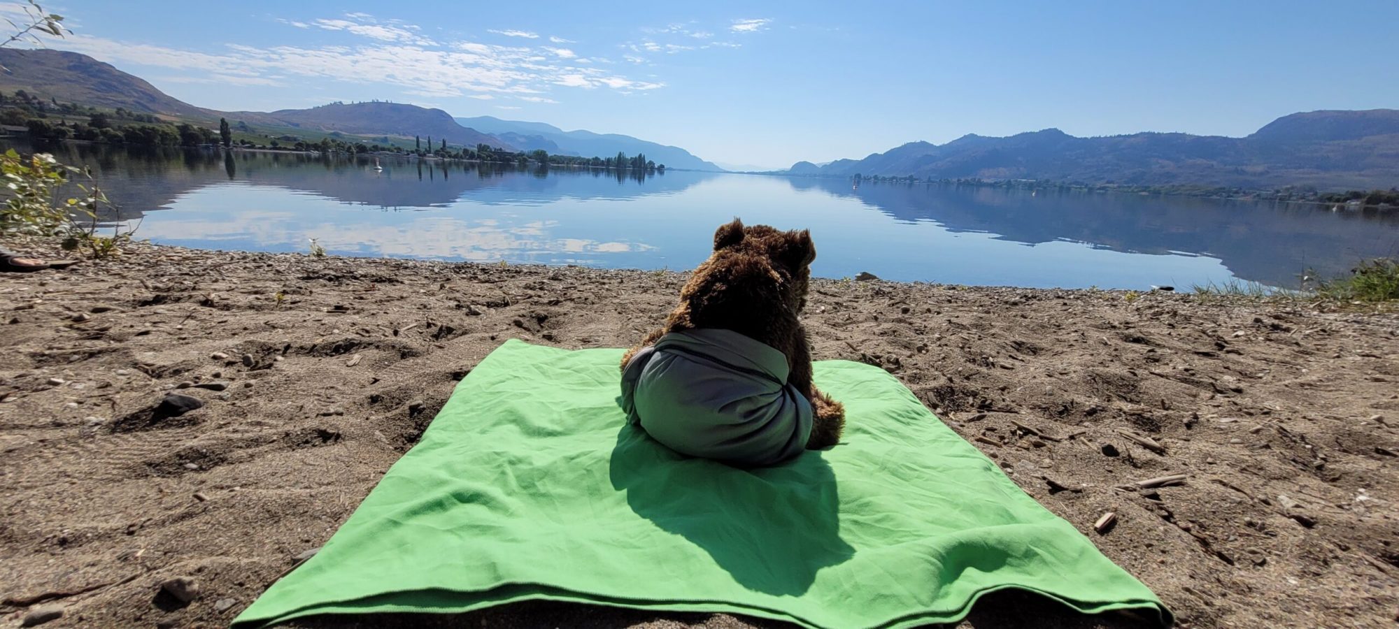 Gegen Mittag waren wir dann schon auf unserem Campingplatz. Dieser liegt auf einer kleinen Halbinsel mitten im Osoyoos Lake. Wir haben sogar unseren eigenen kleinen Privatstrand mit Blick auf die USA. Die Grenze zur USA ist derzeit nur ca. 3 km entfernt. Die Berge im Hintergrund sind schon hinterhalb der Grenze.