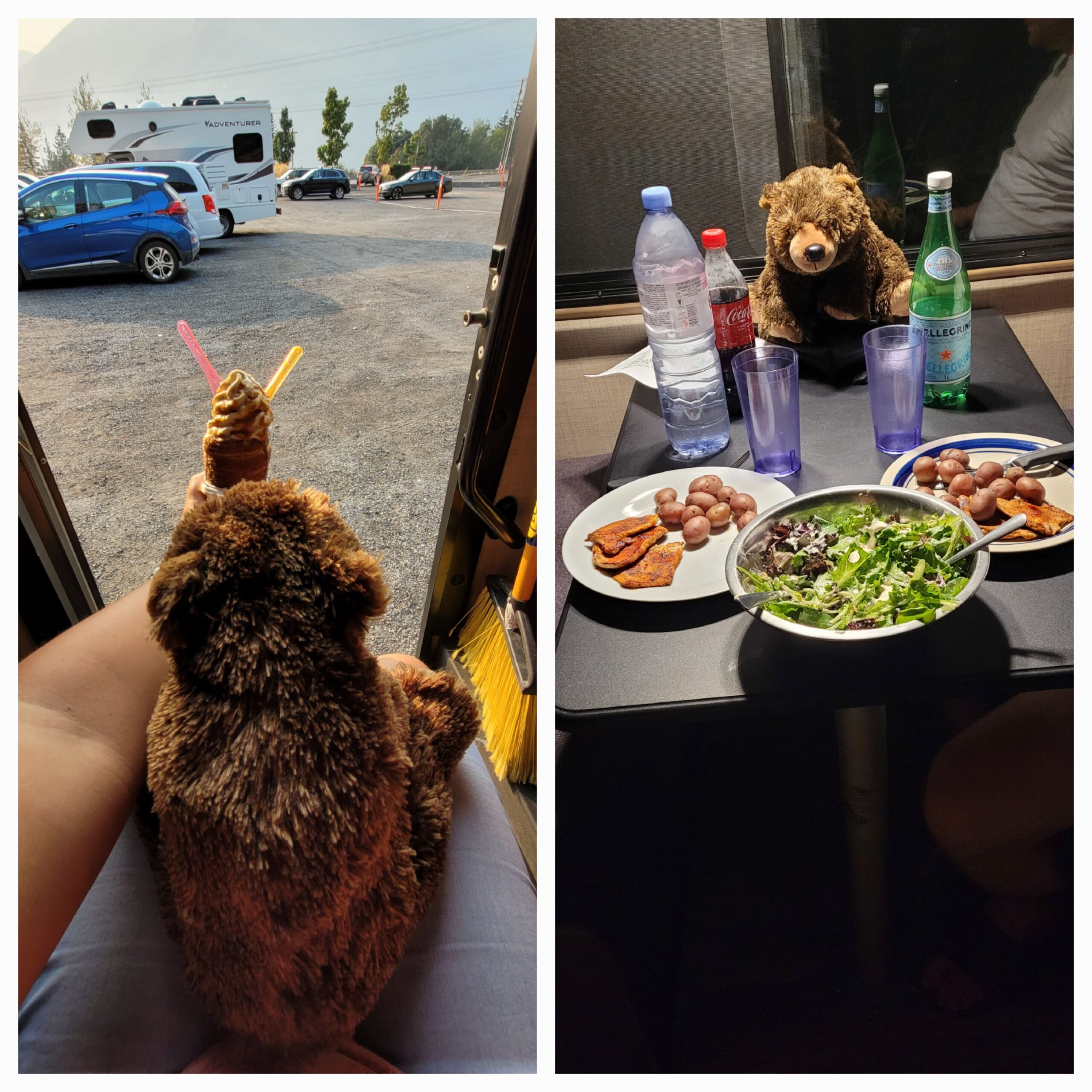 Links: Buddy hat sich nach der Gondel noch ein Eis🍦gegönnt. Rechts: unser erstes Essen im Camper😋